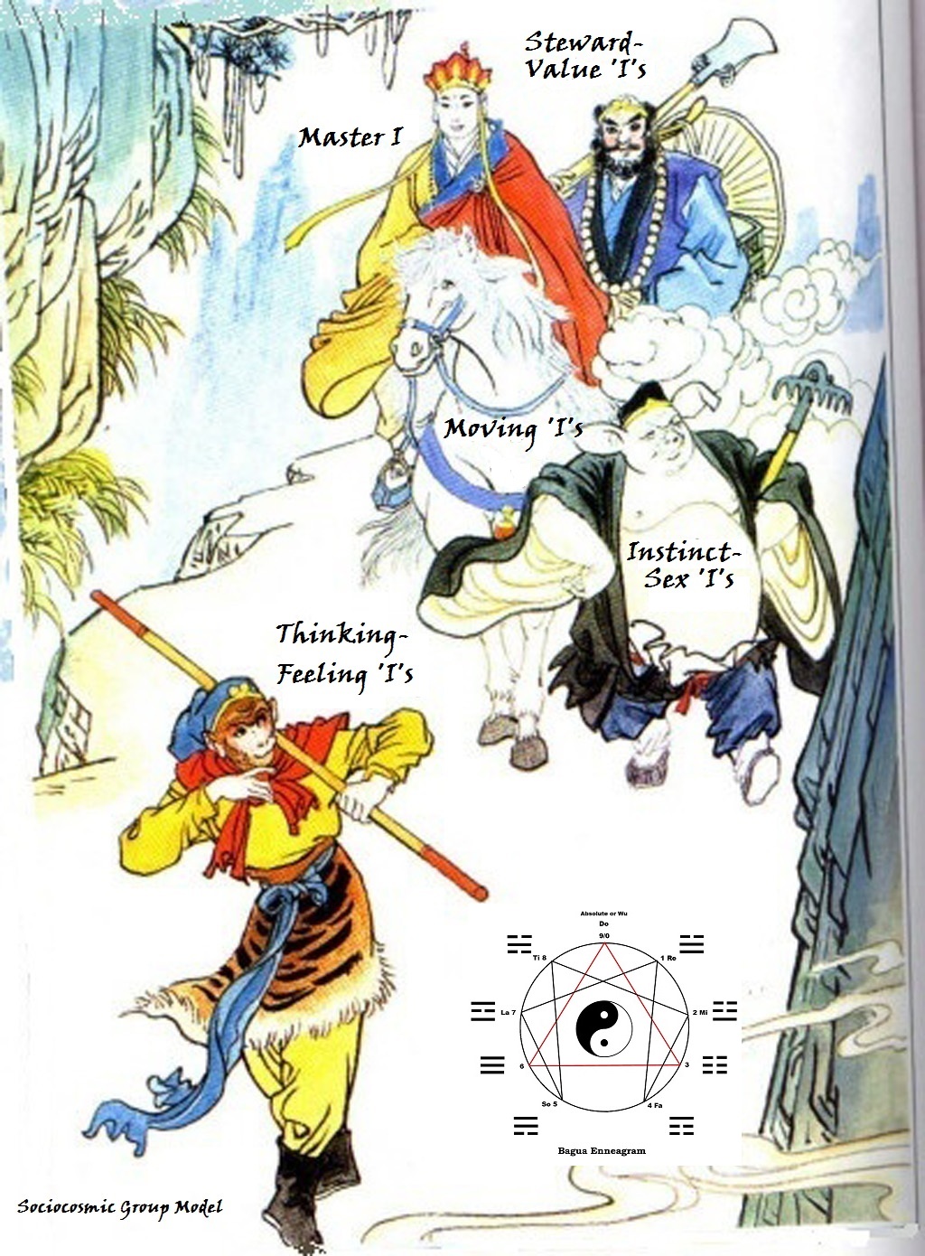 During this Sun Wukong period the technocosmic octave has not yet budded and the only sociocosmic octave prevailing is the sociocosmic stopinder being bearing the common name 'Kingdom' or 'Dynasty' where the gravity-center focus is the feeling-moral stopinders supported by the reasonably 'objective' reasonings. The model of man is depicted by the Chinese during the Piscean Astrological Age. No sciences, technologies or machines were introduced into the tales - they belong to the coming Aquarian Astrological Age.