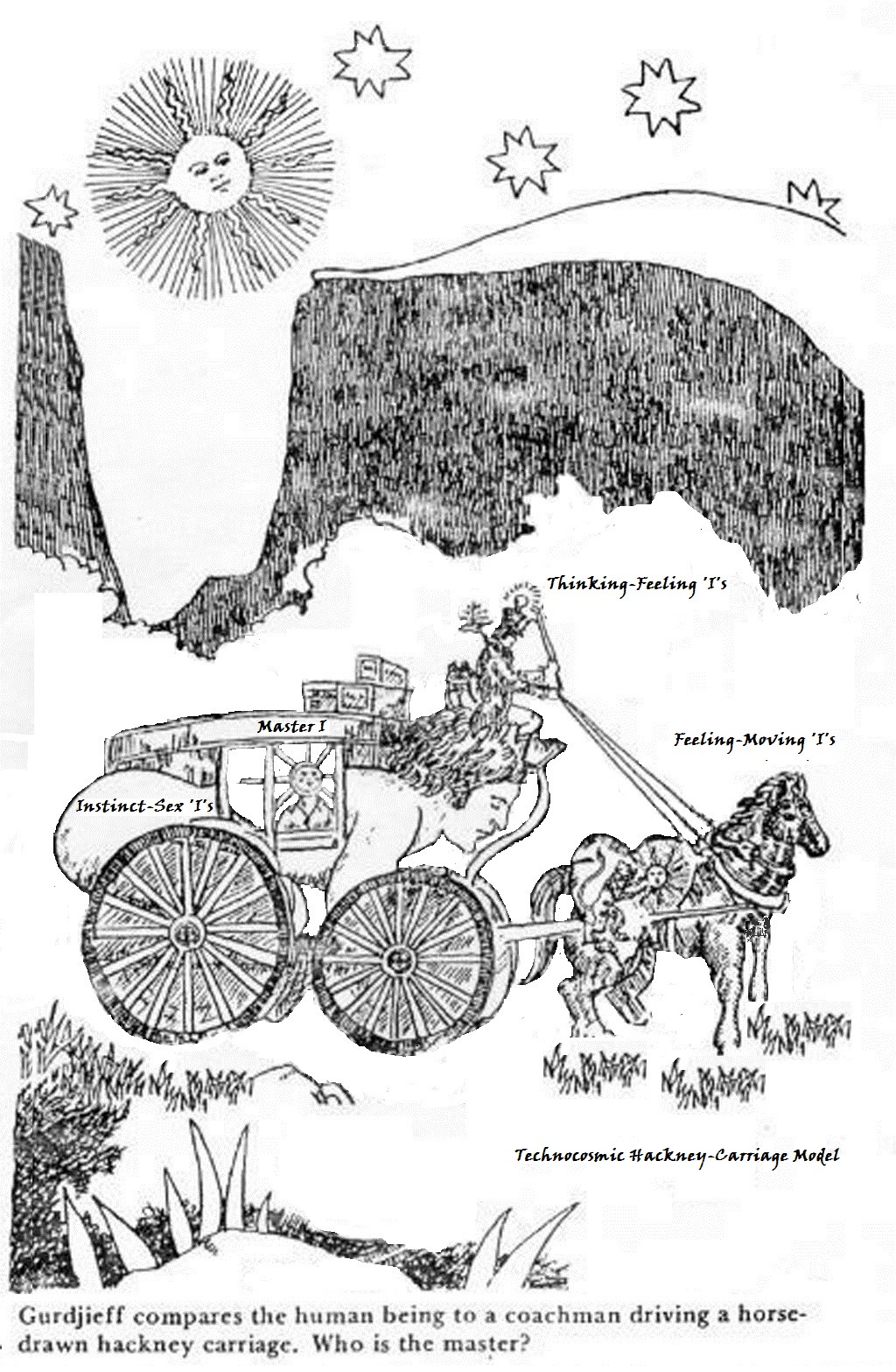 "Through the lens of Fourth Way and in the opinion of Real World Views, within the context of Earth Civilization and her civilization beings and sociotechnocosmic development, the 1st Way is the Way of the Physical Infrastructure Carriage of the Carriage Body No. 1 of a civilization, the 2nd Way is the Way of the PDCE of the Horse Body No. 2 of a civilization, the 3rd Way is the Way of the Design and Construct Management PESTLESHEIGRENS(+) of the Coachman Body No. 3 of a civilization and the 4th Way is the Way of the collective NOO of the Noetic Cosmosophy and Cosmology of the Passenger Body No. 4 of a civilization."