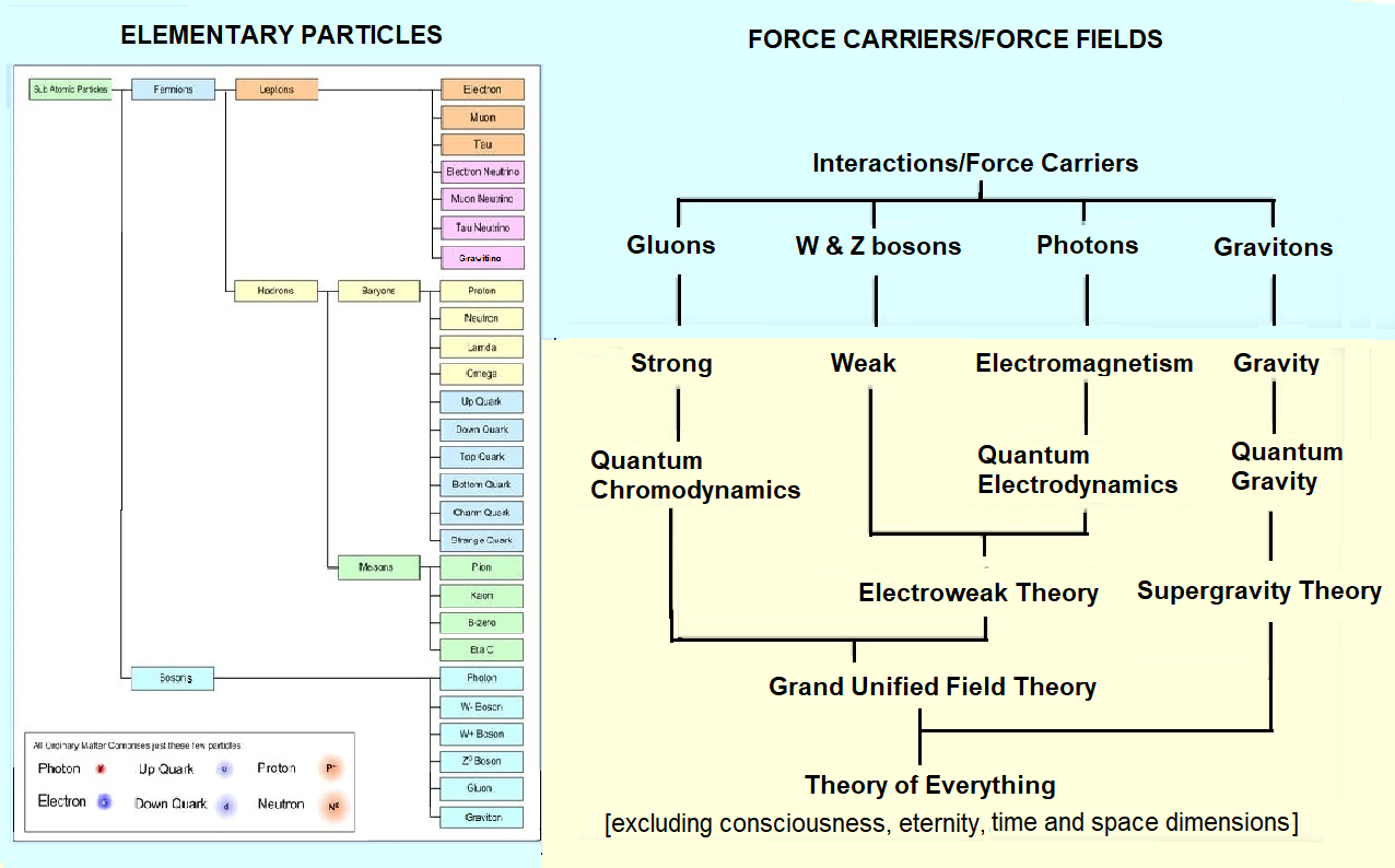 The standard model of elementary particles is the 'Theory of Everything' physical but not the ultimate 'Theory of Everything', for the ultimate 'Theory of Everything' must also include the cosmic force field of consciousness or cosmic psychic or cosmic life and the force field carrier known as the Omnipresent Okidanokh.  Note that life and/or consciousness are very real, a metaphysics beyond but inclusive of wave-particles and real vibration!