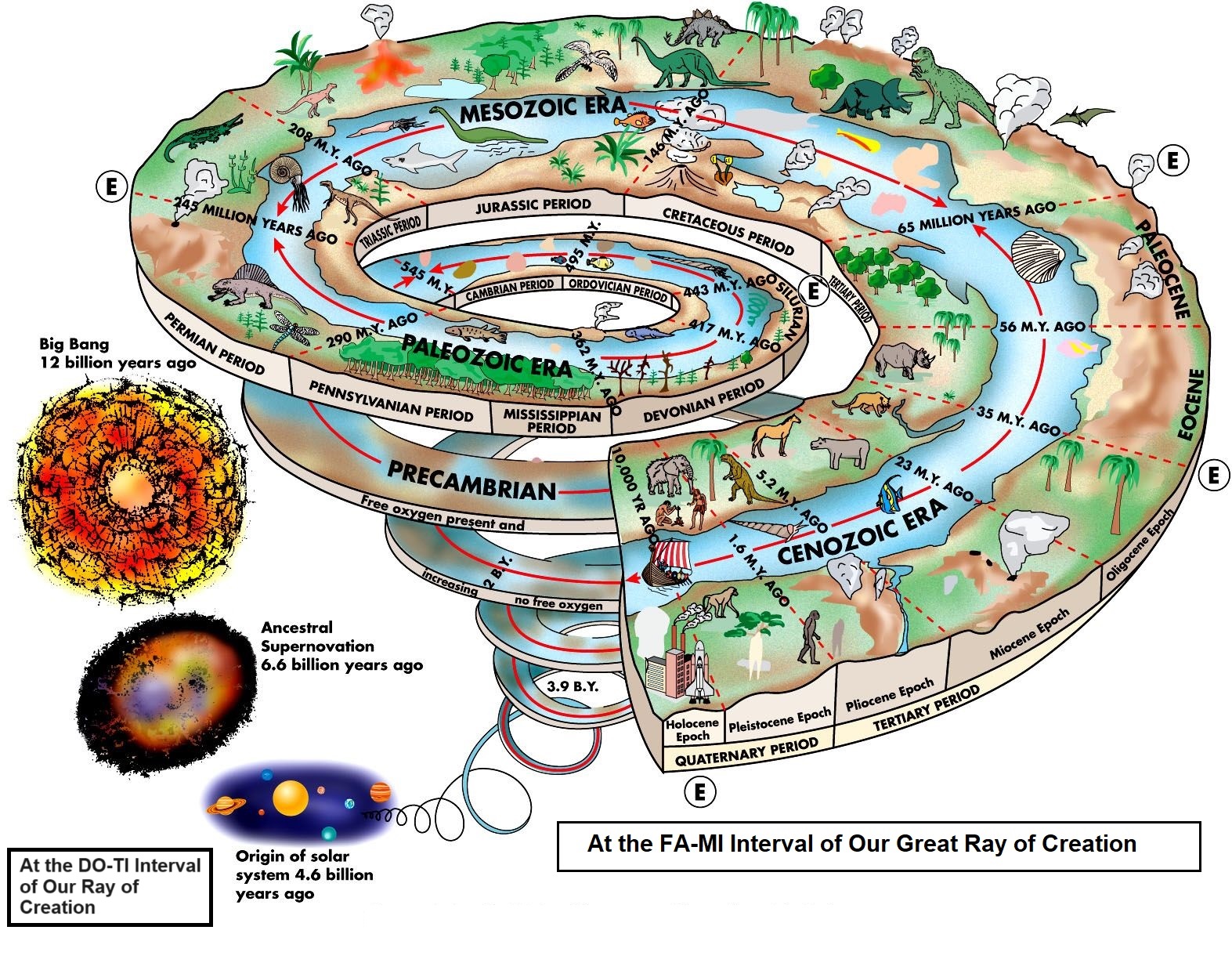 The Cenozoic Era which began 70 million Earth years ago (Cenozoic means recent life). This is the Age of the Mammals, the new biocosmic lau stopinder beings. These modern models of beings of the active mammalian octave began to replace the ancient model of biocosmic beings. The period saw a rapid decline in the reptilian octave. According to this remarkable individual, there are seven periods in this FA-Historical Biocosmic Octave, and they are: The Do-Paleocene Period (70 to 55 million Earth years ago): The first primate and the rodents dominate this period. The Re-Eocene Period (55 to 36 million Earth years ago): Being-lemurs and being-tarsiers with even-and odd-toed hoofed mammalian beings. Some are carnivorous. The Mi-Oligocene Period (36 to 26 million Earth years ago): The modern orders of biocosmic mammalian octave beings have replaced the archaic types of beings. The prototype biocosmic lau stopinder beings are the first anthropoids or just the being-monkeys and being-apes. The Fa-Miocene Period (26 to 11 million Earth years ago): This period saw the appearance of true anthropoid apes known as being-Dryopithecus. The So-Pliocene Period (11 to 1 million years ago): This is also the beginning of extremes of zoned temperatures. The apes became advanced man-apes. The La-Pleistocene Period (1 million to 10,000 thousand years ago): The Earth was covered with ice in many areas. There were four ice ages. The First primitive ape-man began to appear to the final emergence of modern man or the Homo sapien beings. The Ti-Holocene Period (commencing 10,000 thousand years ago), after the last glacial period: The modern man-being becomes the biocosmic lau stopinder being of our period.