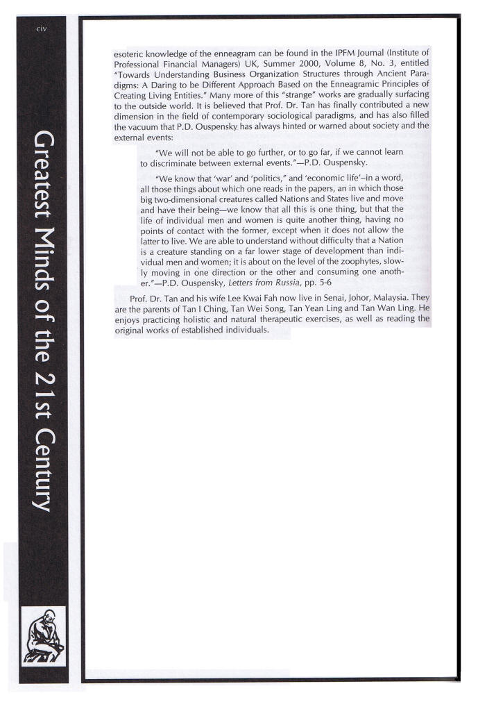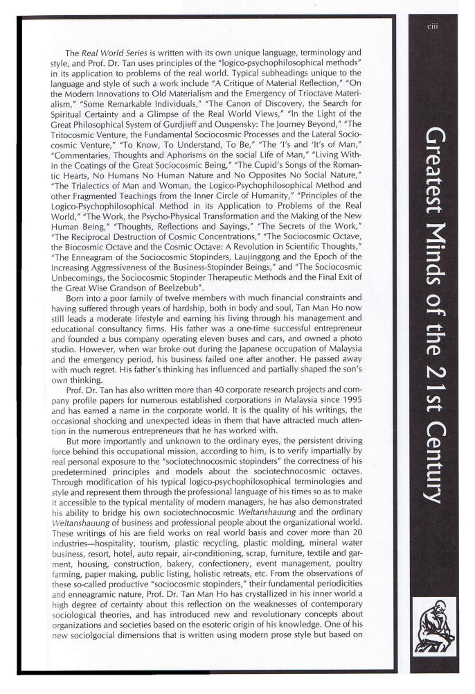 Born on February 6, 1953 in Kluang, Malaysia Tan Man Ho (Chen Wanhe 陈万和) was already known as a critical philosophy thinker and writer after completing his work A Philosophy of Material Reflection (1971-1975) before he was introduced to the Work in 1975 through his colleague and close friend the deceased Mr. Shamsher Singh whom he respected as one of the remarkable individuals. Subsequently, he maintained close contact with him for the next 15 years during which he developed through conscious labor and intentional suffering the permanent 'I' of the Work. During this period, even without his teacher's knowledge initially, he began writing his Real World Views series, a 23 books series which was "completed" in May 1997, seven years after they have "separated" in 1990. The last book series is a further records of articles in 3 books. Tan Man Ho's parents were both from Nanan in the province of Fujian, China. His father came over to Rembau, a district in the State of Negeri Sembilan in the Federation of Malaya in 1905 and married Lee Kim Lian (his mother) who is also a Fujian Chinese was but born in Rembau, the State of Negeri Sembilan. There are 10 siblings in the family and Tan Man Ho (Chen Wanhe) is the last.In 1990, Tan Man Ho relocated from the center of being-'Johor' and stayed in the southern region of the state of this sociocosmic being-'Johor' which later a new sociotechnocosmic 'I AM' initiated by power-possessing beings of the 5th level of the sociocosmic octave there witnessed the creation of a new futuristic sociotechnocosmic zarooarian seed now fully known in the world as being-'Iskandar' whose name is derived from the mystical ancient powerful being known as 'Alexander the Great'. Having made reflective observation on a daily basis of the rapid growth of this Iskandar seed and also its supportive umbilical nursing at the early infantile stage by a neigboring matured sociotechnocosmic 'I AM' already known in the world as the successful being-'Singapore' and another distant one again fully and worldly known as being-'China', this futuristic HEIGRENS principled Iskandar being will successfully grow into a great and mature sociocosmic zarooaritopia of the last note of a zarooarian octave. Key words begin to form rapidly in the spiritual stopinders of biped-beings there such as 'Forest City' (G), 'Holistic Development' (H), 'Holistic Health' (H) 'Educity' (E), 'Integrative Development' (I), 'Sustainable Iskandar' (S) 'EcoWorld' (shades of I, G, N, etc) ... and these words will become common language very soon. Mr. Shamsher Singh, Man Ho's close friend, died in February 8, 1997. A further 2 books in the Real World Views series were completed in 2004 making the set to 22 books and a final book 23 is on completion by 2020. He also wrote some singled titled books such as An Inquiry into the Nature and Process of Privatization and Economic Reforms, On the Possibility of Transforming the Captive Communication and Behavioral Styles in a Manager and translated Orage's On Love into the Malay Language. In general, the works of Tan Man-Ho began in 1970 and the whole work can be divided into 3 categories, A. B and C based on the depth of the subject matter, client segment and specific titles. The category A works are psychophilosophical books specializing in the innovative development of new ideas, methods, approaches, dimensions and paradigms irrespective of areas of concentration. The major areas of concern and contribution to humanity are directed towards the study of man, the study of nature, the study of society and the study of the universe. The studies are currently recorded in 23 books under a title: Real World Views (but previously known as Views from the Real World - Series I through 23). This is the most important essence contribution in his life work. The Category B works are management consultancy project papers, published and submitted for organizations and clients. The project papers covers more than 20 types of related and non-related industries, ranging from car air-con. retail, remanufacturing & recycling, plastics remanufacturing & recycling, hospitality & tourism, housing development & construction, spring manufacturing, auto repair service, car A/C compressor remanufacturing, wood-based furniture cum interior decoration, garment manufacturing, plastic recycling, bakery ingredients manufacturing, bakery & confectionery retailing, privatization project of Central Johor Bahru Town Council, events management, paper recycling, integrated poultry farming, hotels & resorts and scraps business. Some of his project papers have been successful for funding from the Ministry of Culture, Arts and Tourism of Malaysia. This work is his second major contribution to the well-being of what he calls, in Gurdjieffian style, the "sociocosmic stopinder beings" of the "Periodic Table of the Sociocosmic Octaves". Besides developing the periodicity of the sociocosmic stopinders, he has also developed the periodicity of the biocosmic and the technocosmic stopinders. The biocosmic stopinders are developed in accordance with the Linnean Taxonomy of Biological Life but with a difference that in his periodicity of the biocosmic stopinders the principles of the laws of trialectics and the laws of octave are applied. The formal Linnean Taxonmony is based on formal logical conventional classification with no inclusion or attempt or perhaps no knowledge about the possible operation and motion of the laws of three and seven in the evolution of life. The general application of the Tri-Octave Theory to the understanding of biology, sociology and technology, and cosmology (Gurdjieff-Ouspenskian) is unique to the works of Professor Dr. Tan Man Ho. The Category C works are specific titled books of the author. These include A Philosophy of Material-Reflection: 1971-1975, An Inquiry into the Nature and Process of the Recent Privatization and Economic Reforms, On the Possibility of Transforming the Captive Co